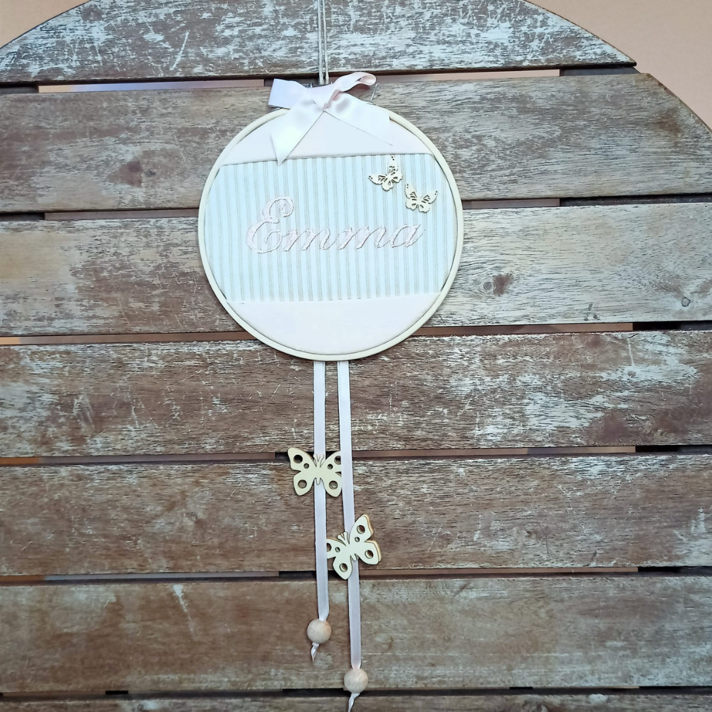 Fiocco nascita per neonato montato su struttura in legno confezionato con tessuto di cotone e ricamato